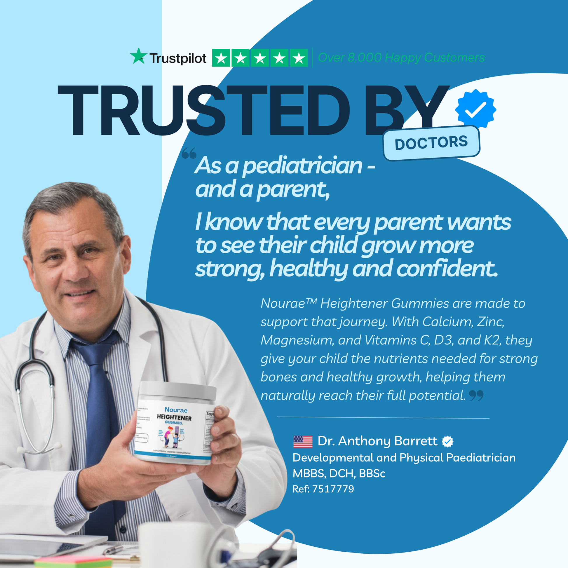Nourae™ Heightener Gummies are natural daily gummies designed to support healthy growth. We combine essential vitamins and minerals that strengthen bones, boost immunity, and help you reach your full height potential.